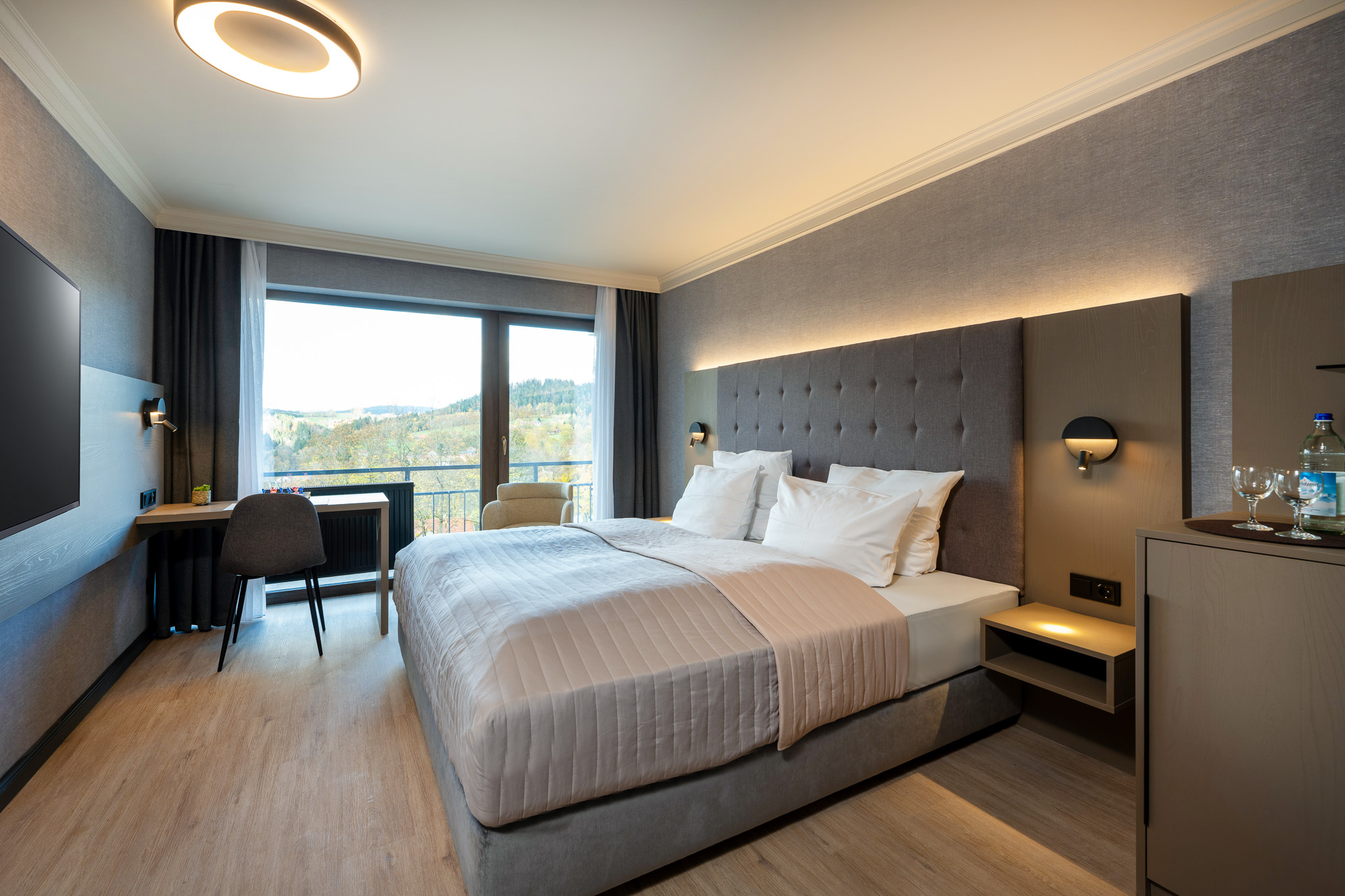 Elegant und gemütlich zugleich: Der Comfort Room bietet auf 24 m² ein King-Size-Bett, ein modernes Bad mit begehbarer Dusche und einen Balkon mit Blick ins Grüne – ideal für erholsame Tage im Sonnenhof Grafenau.